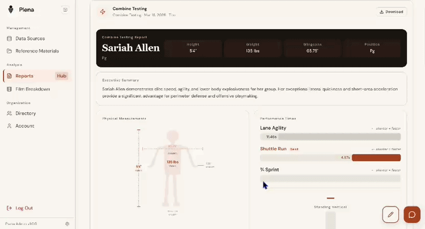Every report is generated from data, cites its sources, and passes through your coaches before it's final. Below: an actual Player Development report structure, produced by Plena.