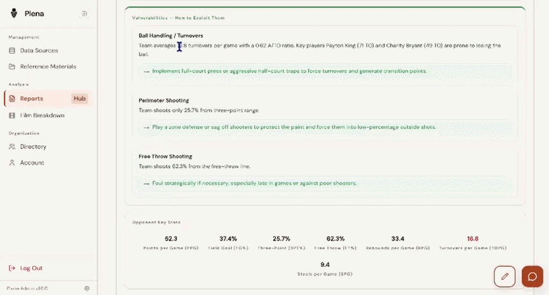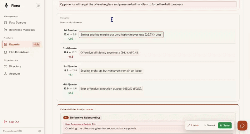 Plena is a system that ingests research, documents, generates auditable reports, and learns from coaches' feedback. We emphasize ease of use, reliability, AI transparency, and staff control on every report.